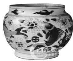 此罐高16.2厘米,口径18厘米,足径14.5厘米;器身施亮青釉,釉面平滑、晶莹。主题纹饰为鲭、鲌、鲤、鳜四种鱼,取谐音“清白廉洁”之意。四周辅以水藻、蟹、虾等水生动、植物。用笔细腻、构图饱满,画面具有大富大贵气派。然而,能享受到鱼、虾、蟹等口福的,多是些做官的。换言之,当了官,才会有此等福分。
